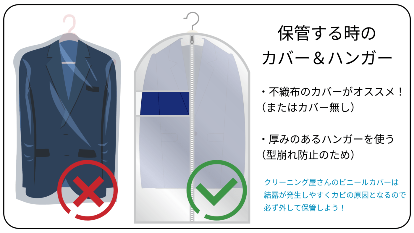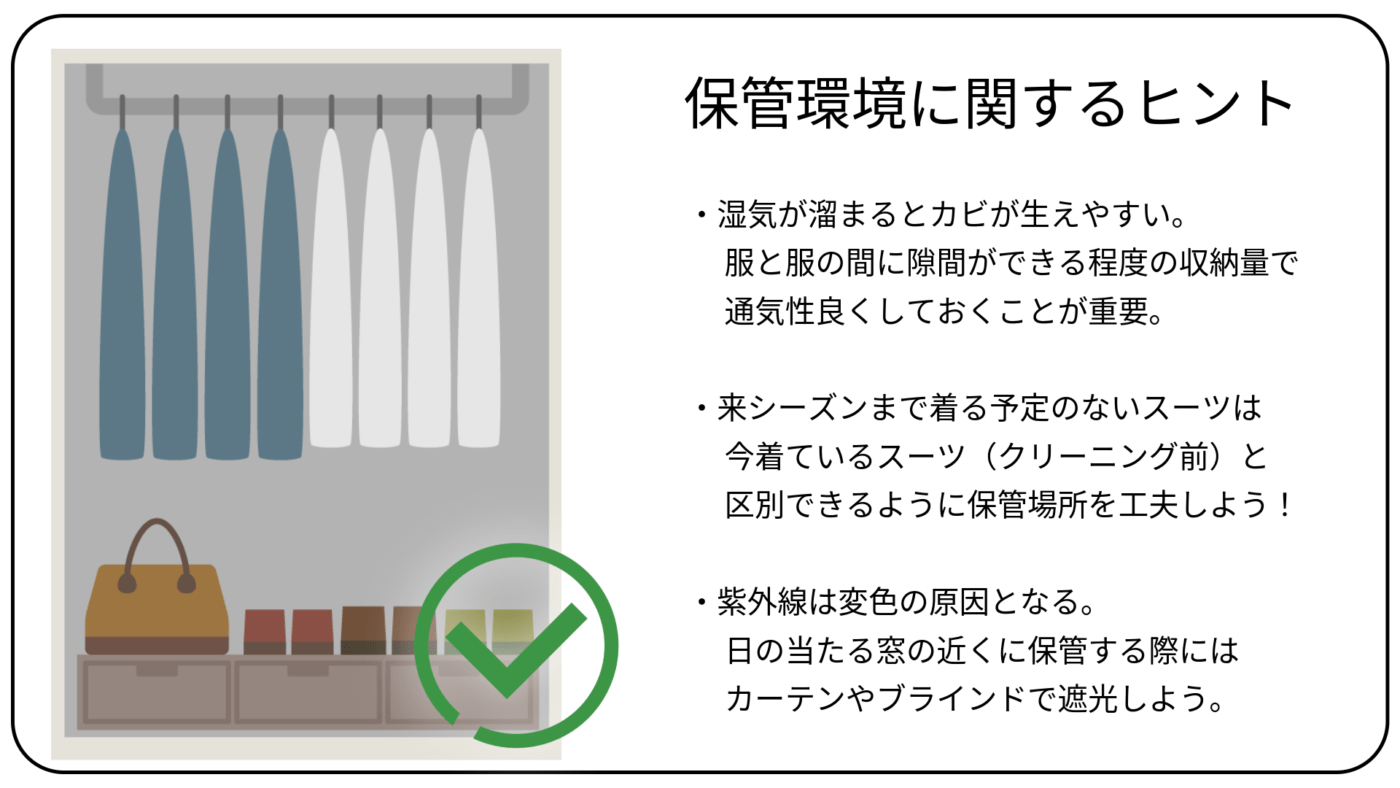 とは言っても、ビニールのカバーのままスーツをクローゼットに突っ込む人は意外と多いようですので「保管のポイント3選」に選出させていただきました。