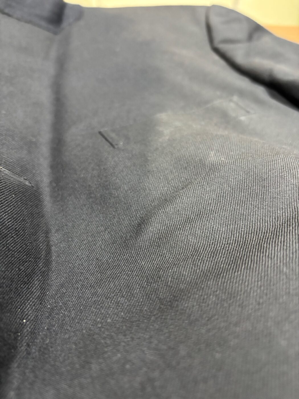 こちらはお客様が長年愛用されてきたスーツのジャケット。長年のドライクリーニングで変色し、襟の跡がくっきり残るほどになっていました。本来のネイビー色が黄ばんでグレーに。襟の部分は板のようにパリパリになって、ウール本来のしなやかさを感じられません。